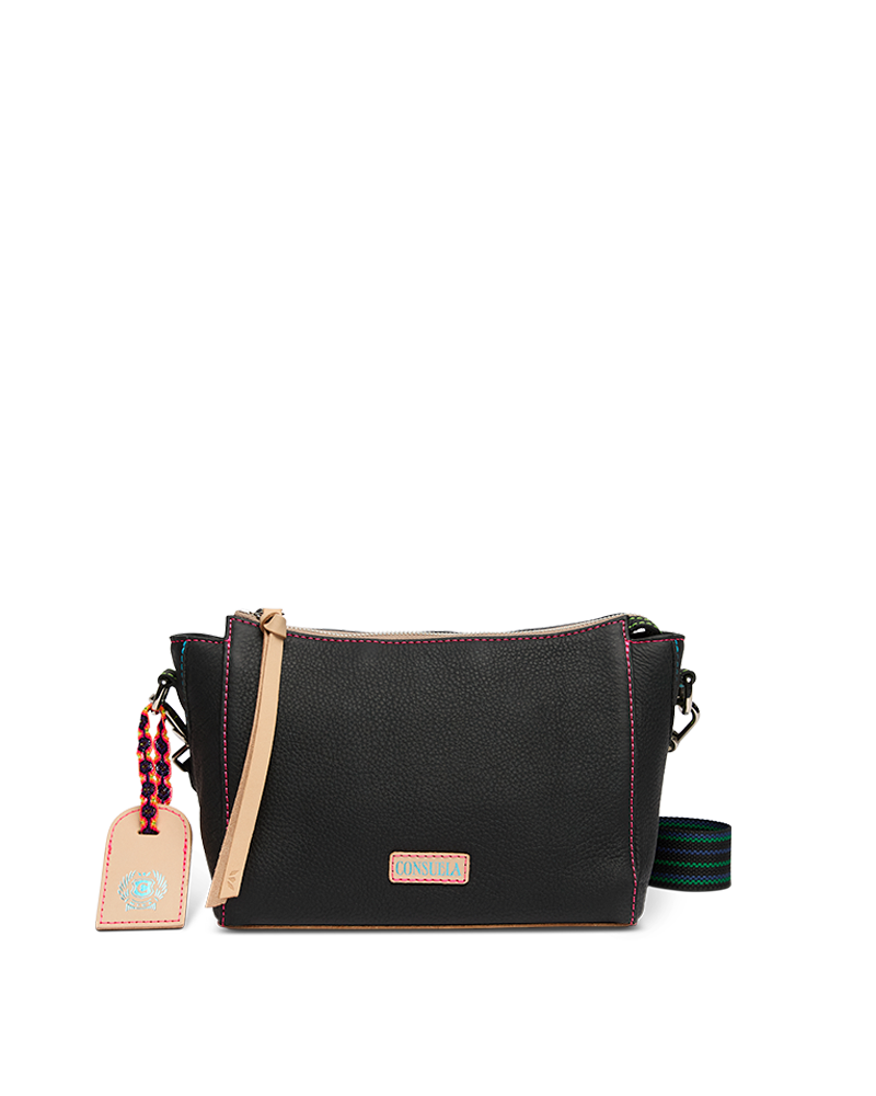 - Includes detachable and adjustable woven crossbody strap