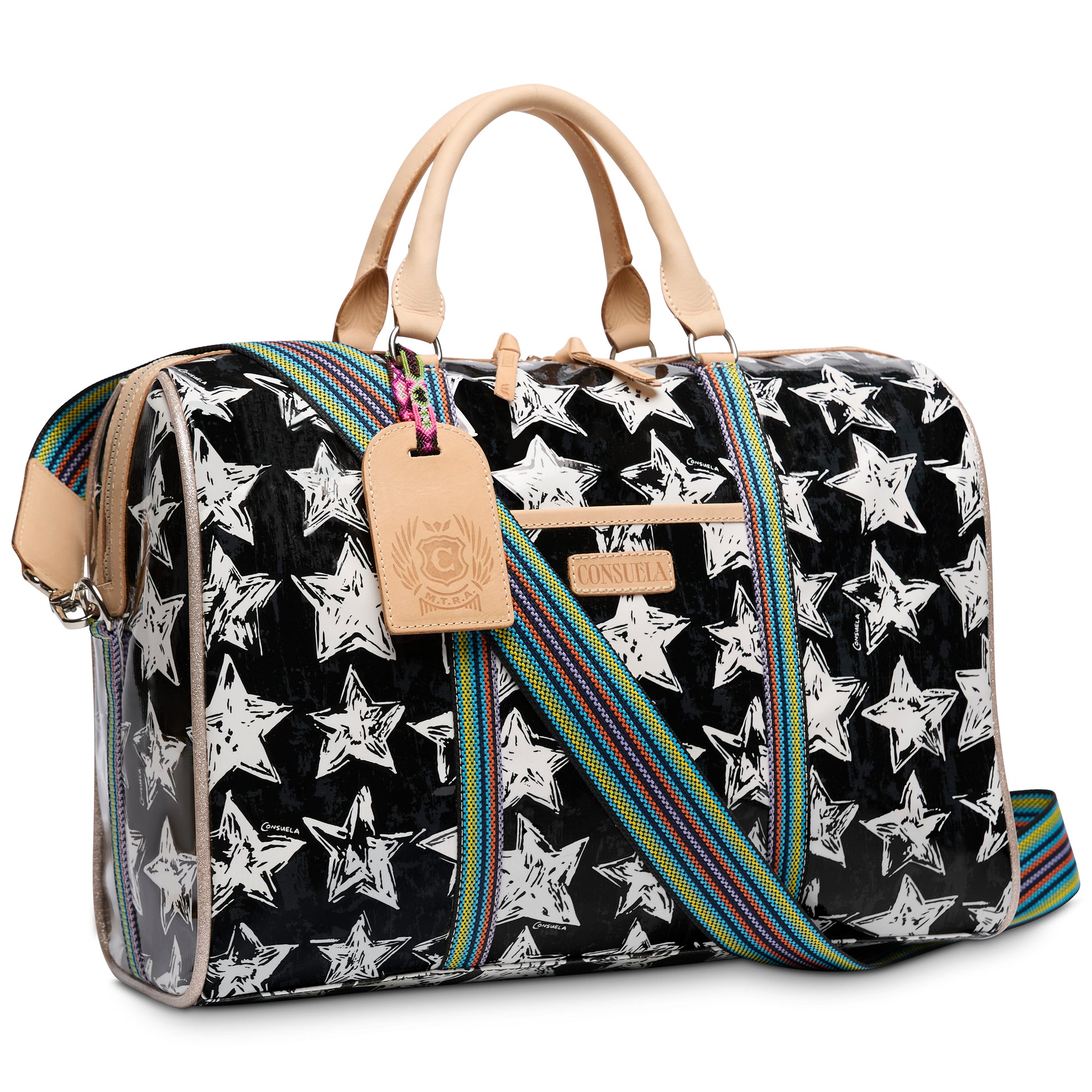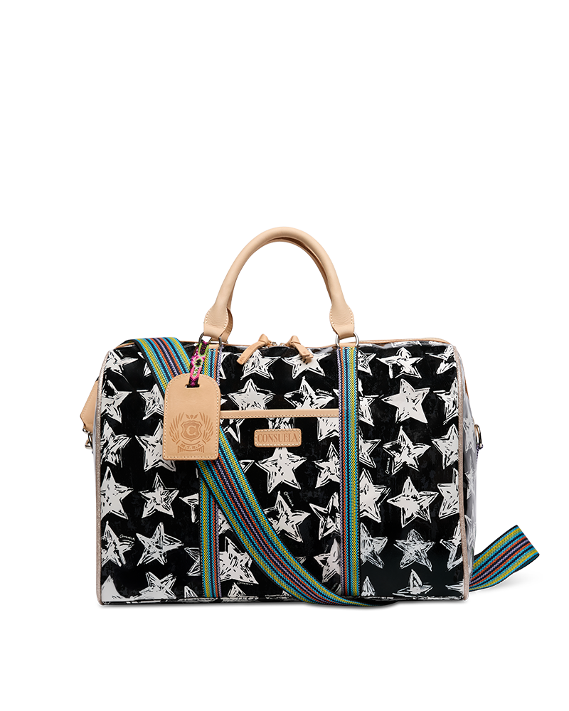 This spacious and colorful duffel is the perfect carry-on for a weekend getaway, making a statement with functionality, durability, and style. Topped with natural leather handles and an adjustable webbing strap, the Jetsetter is crafted to hold its shape and makes traveling easy with ample interior storage and functional pockets.